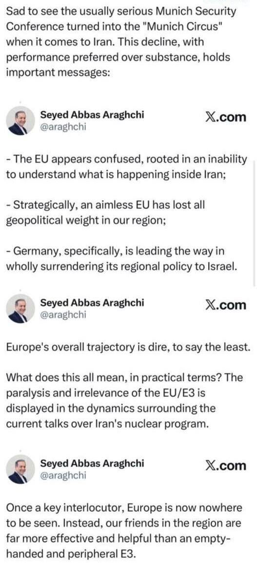 NOCOMMENT.az xəbər verir ki, Araqçi “X” sosial şəbəkəsindəki paylaşımlarında İranla bağlı müzakirələrin “ciddi və real yanaşmadan uzaq” olduğunu vurğulayıb və faktiki olaraq konfransın “Münhen sirkinə” çevrildiyini qeyd edib.