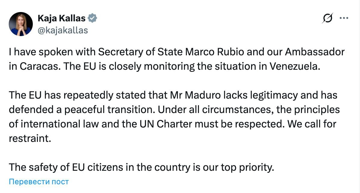 Kallas X sosial şəbəkəsində yazıb: “Aİ dəfələrlə bəyan edib ki, cənab Maduro legitimliyə malik deyil və sülh yolu ilə keçid dövrünün təmin olunmasını müdafiə edib. Hər hansı şəraitdə beynəlxalq hüquq və BMT Nizamnaməsi prinsiplərinə riayət olunmalıdır. Biz təmkinli olmağa çağırırıq”.