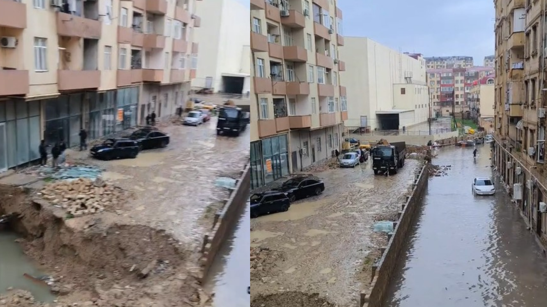 NOCOMMENT.az xəbər verir ki, sözügedən yaşayış kompleksinin ətrafında acınacaqlı mənzərə hökm sürür. Sakinlərin binaya giriş-çıxışı tamamilə məhdudlaşıb, ərazi sel sularının əsarətindədir. Onların sözlərinə görə, yağan yağış binanın özülünə dolub. Qeyd edilib ki, yeni tikilən binanın orta hissəsi boşdur və hər an çökmə hadisəsi baş verə bilər.