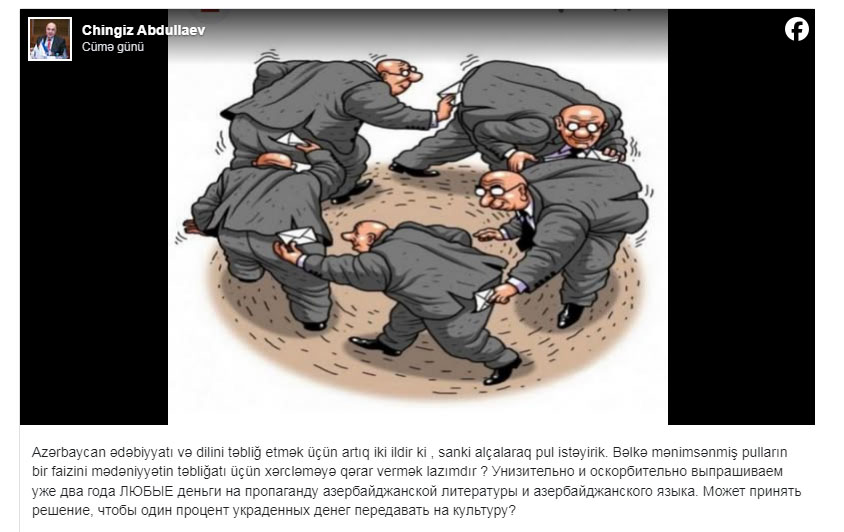 Paylaşımında o, mədəniyyət sahəsinə ayrılan vəsait məsələsinə də toxunub. Çingiz Abdullayev qeyd edib: “Azərbaycan ədəbiyyatı və dilini təbliğ etmək üçün artıq iki ildir ki, sanki alçalaraq pul istəyirik. Bəlkə mənimsənmiş pulların bir faizini mədəniyyətin təbliğatı üçün xərcləməyə qərar vermək lazımdır?”