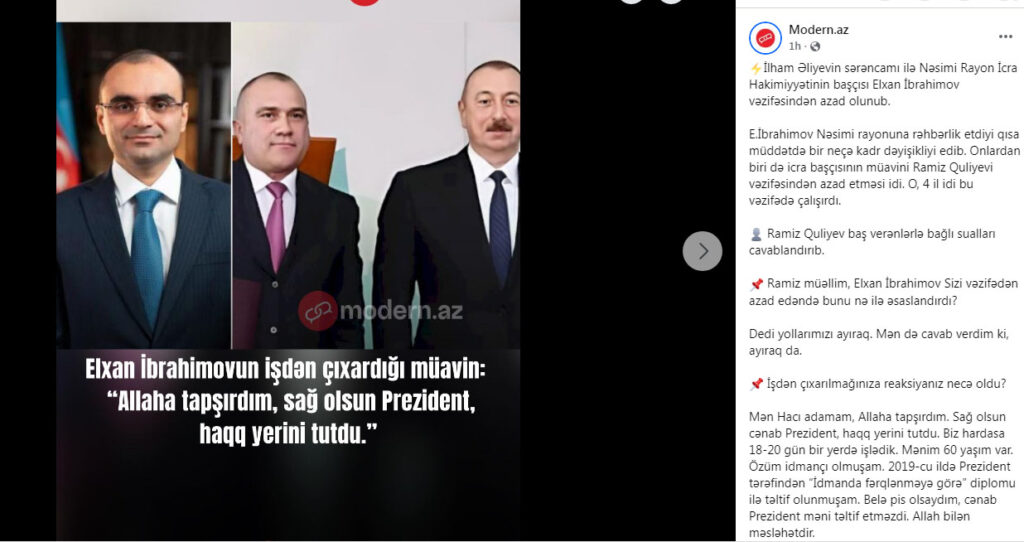 Onlardan biri də icra başçısının müavini Ramiz Quliyevi vəzifəsindən azad etməsi idi. O, 4 il idi bu vəzifədə çalışırdı.