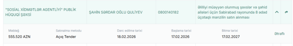 İkinci müqavilə isə həmin rayonda 8 ədəd üçotaqlı mənzilin alınmasını əhatə edir. Bu satınalmanın məbləği isə 555.520 AZN olub.
