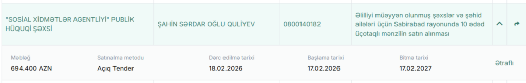 Sosial Xidmətlər Agentliyi Sabirabadda mənzillərin alınması üçün eyni şəxslə iki müqavilə bağlayıb – Ümumi məbləğ 1,2 milyon manata yaxın