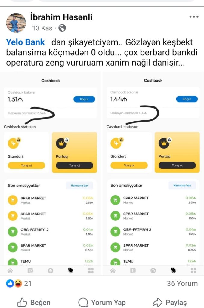 İbrahim Həsənli bankdan bu problemin səbəbi və keşbek məbləğinin niyə silindiyi ilə bağlı aydınlıq tələb edir.